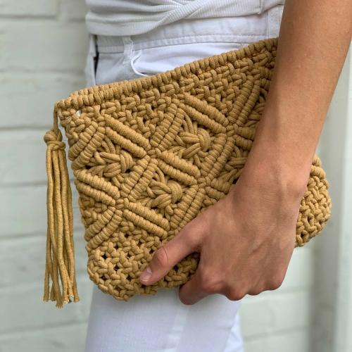 This tan macrame clutch is the perfect complement to any outfit. The bag has a zipper close and the inside is lined. It features a tassel that is a great design touch. Perfect for day or evening.